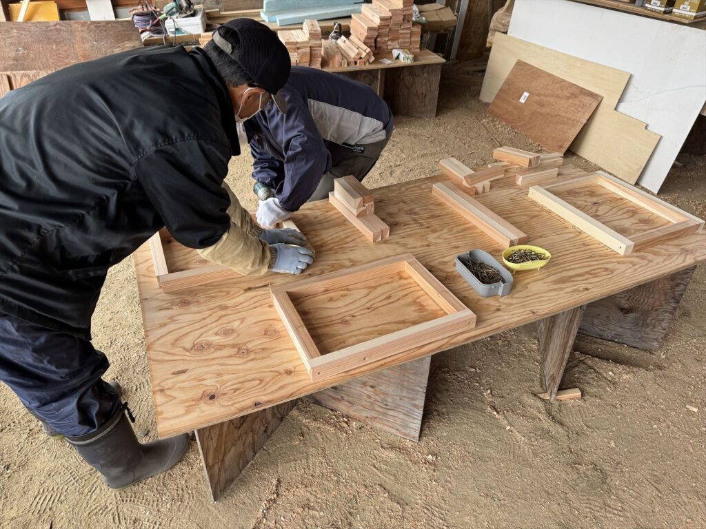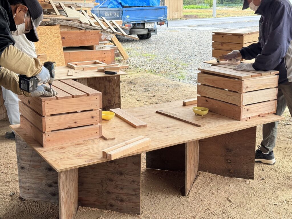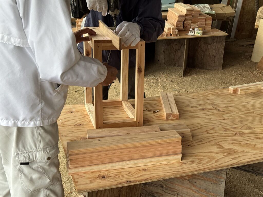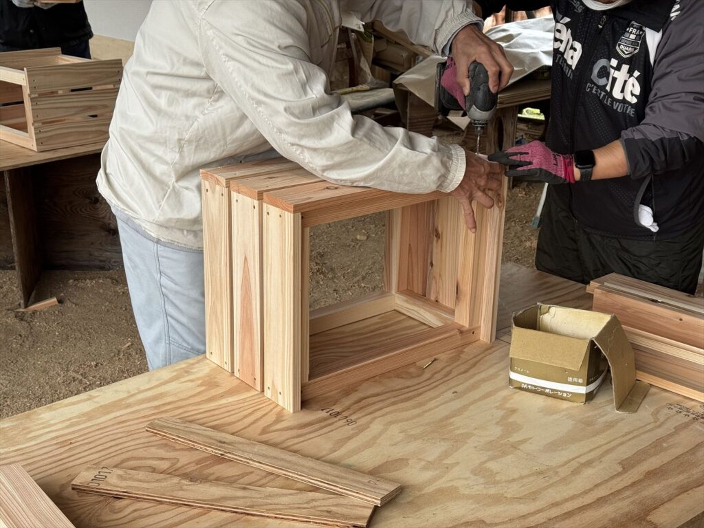 電動工具を使い、木材をビスで止めていくのですが、使い慣れていない様子が伺えました。