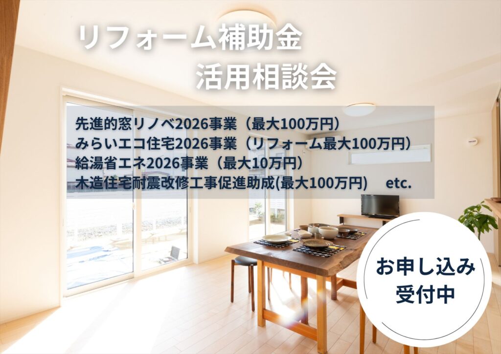 他にも先進的窓リノベ2026事業と同時期に発表されたみらいエコ住宅2026事業(リフォーム最大100万円)や給湯省エネ2026事業などがあります。